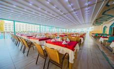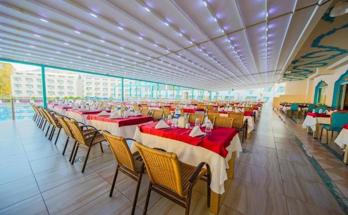 Hotelski sadržaj: Osim glavnog restorana gde se služe pansionski obroci po principu švedskog stola hotel nudi i a la carte usluge u ribljem restoranu na plaži. Pored turske kuhinje, hotel nudi i veliki izbor jela svetskih kuhinja, tematske večeri, dijetalna i vegeterijanska jela. Od ostalih sadržaja hotel ima više barova, a neki od njih su pool bar, beach bar, disco bar i bar koji je otvoren 24 sata, gde gosti mogu uživati u raznovrsnim koktelima i širokom izboru pića. Na plaži postoji mogućnost raznih opcija laganih obroka i snekova.