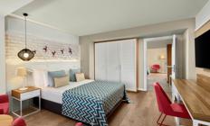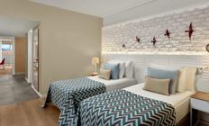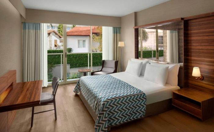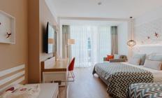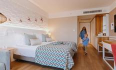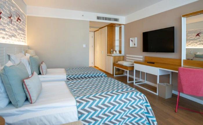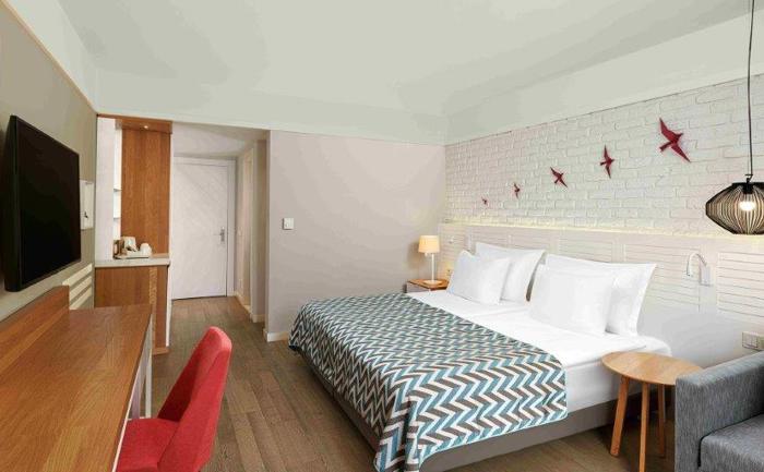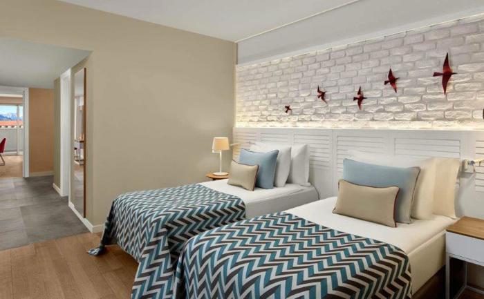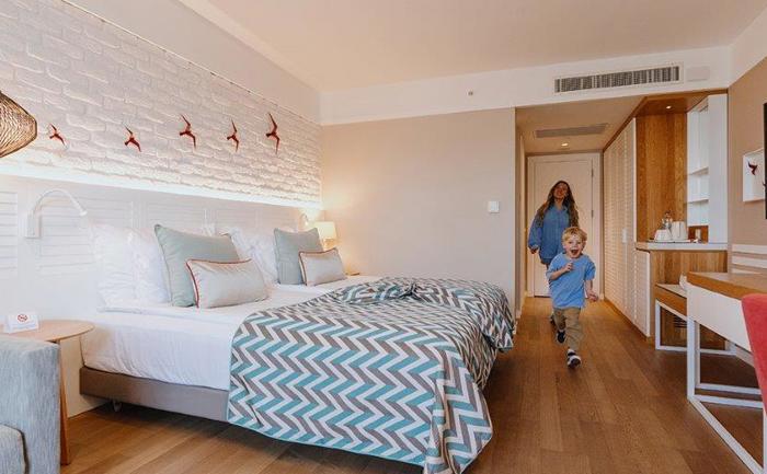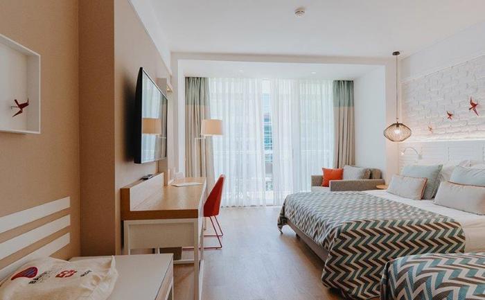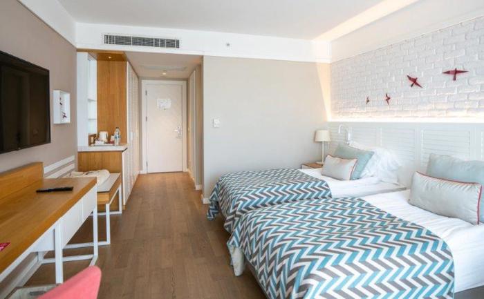 Sobe: Hotel raspolaže sa ukupno 360 soba, koje mogu biti superior, deluxe ili apartmani. Superior sobe (površine 24-28 m²) mogu biti sa francuskim balkonom ili terasom i mogu imati pogled na kopno ili more. Maksimalan kapacitet tri osobe i jedno dete ili tri odrasle osobe. Deluxe sobe sa pogledom na more (površine 32 m²) mogu smestiti maksimalno tri osobe. Porodične sobe (površine 83 m²) sastoje se od dve sobe odvojene vratima. Mogu smestiti maksimalno četiri odrasle osobe. Deluxe Suite with Jacuzzi (površine 73 - 86 m²) sa odvojenom spavaćom i dnevnom sobom sa đakuzijem. Penthouse Suite (površine 56 m²)  sastoji se od spavaće i dnevne sobe. Maksimalan kapacitet tri osobe i jedno dete. Sve sobe su moderno operemljene i imaju  kupatilo, mini bar, sef, ketler, klimu, balkon.